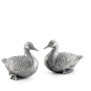 Invite the tranquility of nature to your dinner table with the Duck Salt & Pepper Set. Part of the esteemed Morning Hunt collection, this set is detailed artfully to appear as graceful mallards floating over a water surface. Meticulously crafted in Pewter, the compact size of 1.25"W x 2.5"L x 2"T inches subtly complements your table setup without dominating the space. Perfect for luxury home decor, this premium wildlife table accessory makes a delicately whimsical statement at dinner parties.