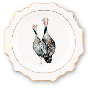 Introducing the Norwood Narragansett Turkey Bone China Scallop Dinner Plate. This 10.5 inch diameter plate effortlessly fuses modern aesthetics with classic themes, embodying the spirit of Fall. The generous size is ideal for serving delectable fine dining dishes to your esteemed guests. Crafted by Vagabond House's master artist, Helen Richard, each piece boasts a unique woodland theme design and an elegant gold rim which, together, add a touch of class to your table. This versatile plate, part of our Harvest collection, is the embodiment of luxury and sophistication, making it the ultimate choice for dinner parties and thoughtful gifting.
