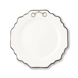 Experience luxury dining with this stylish 8.5" diameter Salad plate from our Equestrian Collection. Immaculately crafted from Bone China and Pewter, this plate features a unique scallop design rimmed in platinum, ideal for any elegant gathering. The equine-inspired pewter bit enhances its charm, making it a perfect unique gift for horse enthusiasts. Its compact size is perfect for serving salads or desserts with a touch of sophistication.