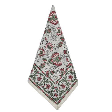 Napkins: 20″ × 20″, finished with matching embroidery and scalloped edges.