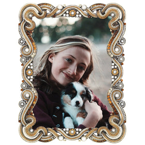 Cast pewter picture frame in bronze finish with dozens of hand-set European crystals, tiger’s eye and faux pearls. Elegant moiré silk back with easel for vertical or horizontal placement. Tarnish resistant. Signature luxury gift box included.