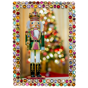 An enchanting trove of cheerful and eye-catching color. Gold finished cast pewter picture frame with hand-set multi-colored European glass gems. Elegant champagne hued moiré silk back, with easel designed for vertical or horizontal placement. Beveled glass. Tarnish resistant. Signature luxury gift box included.