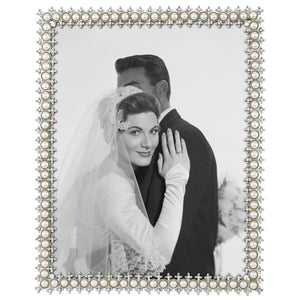 Delicate details with hand-set clear European crystals and faux pearls in gold or silver finished pewter picture frame. Elegant moiré silk easel back designed for vertical or horizontal placement. Tarnish resistant. Signature luxury gift box included.