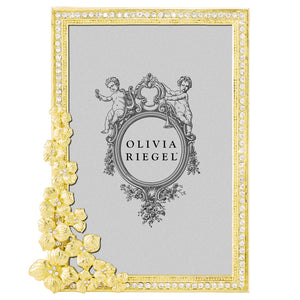 Gold or silver finished pewter picture frame in a floral pattern, encrusted with hand-set clear European crystals. Elegant moiré silk back, with easel designed for vertical or horizontal placement. Beveled glass. Tarnish resistant. Signature luxury gift box included.
