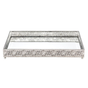 Classic estate jewelry inspired design. Silver finished pewter vanity tray, encrusted with hand-set clear European crystals. Gray moiré silk underside. Beveled mirrored glass. Footed base. Tarnish resistant. Signature luxury gift box included.