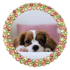 Inspired by the style and glamour of Palm Beach regency. Gold finished pewter picture frame, with hand-set pink and green European glass gems. Elegant champagne hued moiré silk back. Tarnish resistant. Signature luxury gift box included.