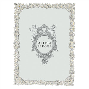 Stunning clusters of hundreds of hand-set clear European crystals in silver or gold finished cast pewter picture frame. Elegant moiré silk back with easel for vertical or horizontal placement. Tarnish resistant. Signature luxury gift box included.