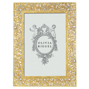 Classic estate jewelry inspired design. Gold finished pewter, encrusted with hand-set clear European crystals. Elegant moiré silk back with easel designed for vertical or horizontal placement. Beveled glass. Tarnish resistant. Signature luxury gift box included.