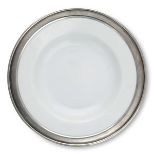 Elegant simplicity. Inspired by Mid-Century Modern design, Vagabond House's Tribeca Soup Bowls are crafted in fine porcelain. Each plate is glazed to a luminous white finish by hand and then encircled with a highly polished pewter rim. The simple elegance of the cool pewter rim and classic white porcelain allows these plates to easily be mixed and matched with others from your collection, or with their matching pieces. The Tribeca pattern is also available in dinner and salad plates.